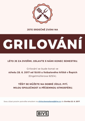 Léto je za dveřmi. Zveme všechny studenty, vyučující a zaměstnance školy na BIVŠ grilování. Které se uskuteční 28.6.2017 u fotbalového hřiště v Řepích (Engelmüllerova 625/4). Svou účast prosím potvrďte na emailem na silvie.dvorackova@bivs.cz